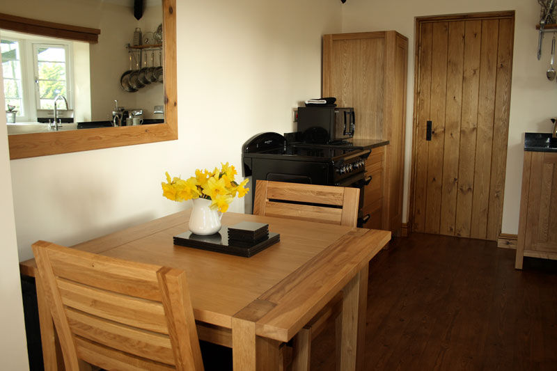 The well fitted solid oak and granite kitchen has a partially beamed ceiling, stable door and views of the Cove and gardens. Fittings include an oak dining table and chairs, an electric range cooker, Smeg fridge with ice making compartment, cafetiere and microwave.